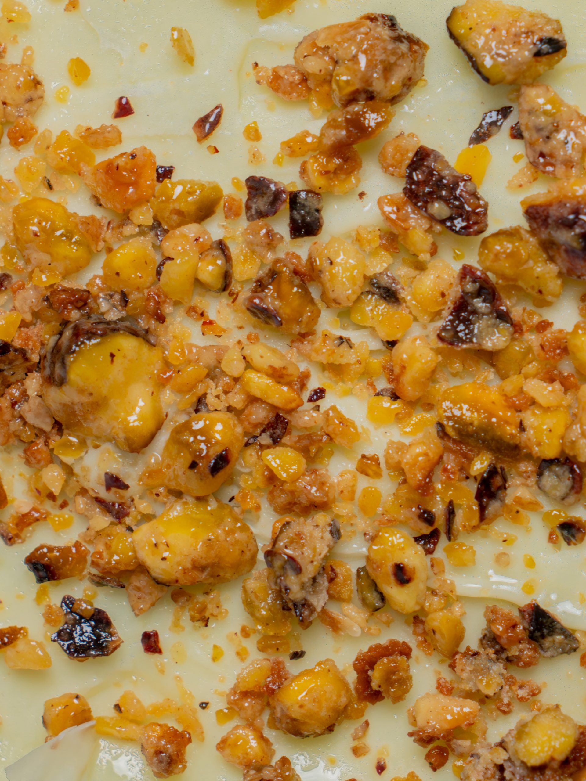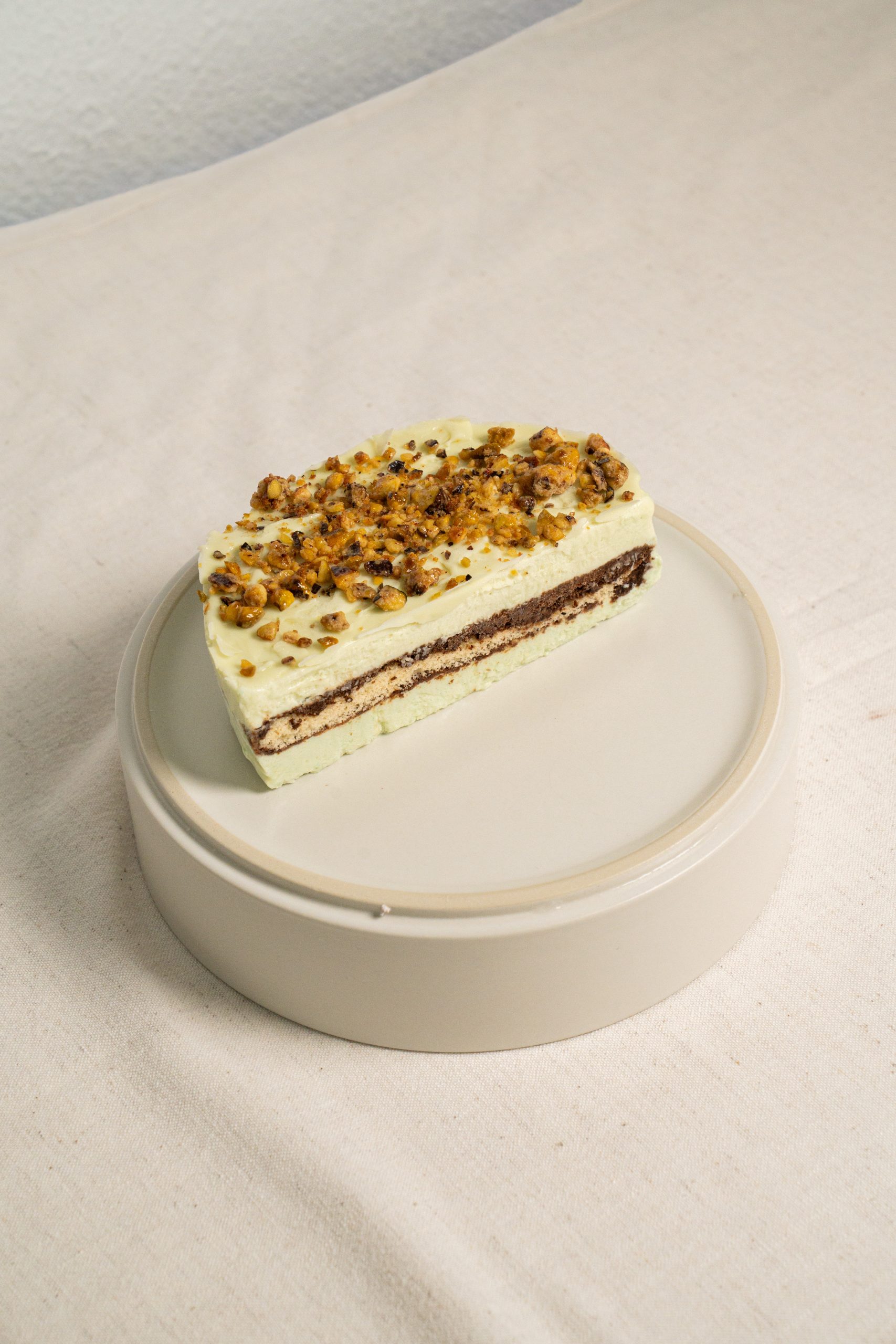 Delicioso tiramisú de pistacho con pistachos garrapiñados y chocolate blanco.